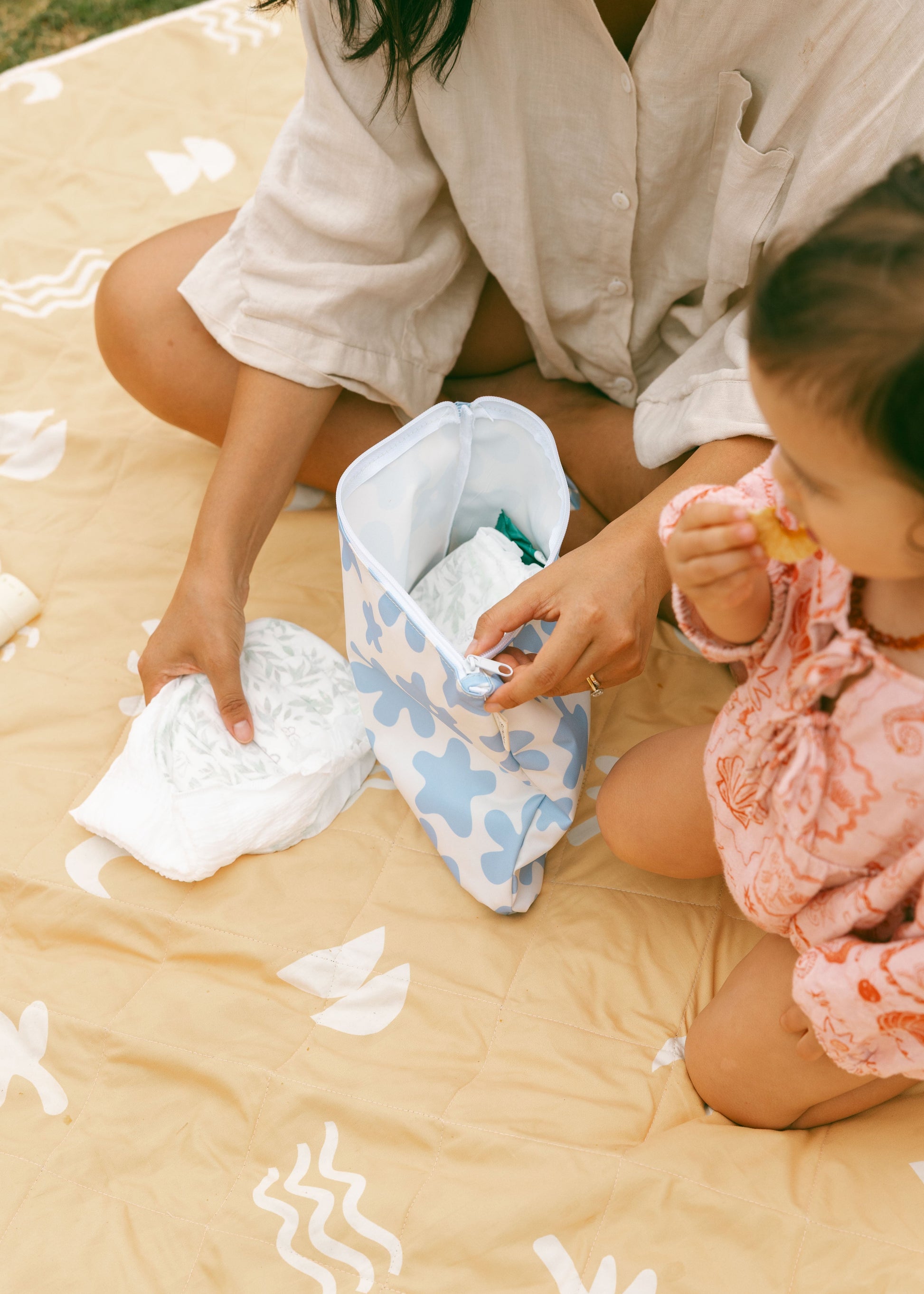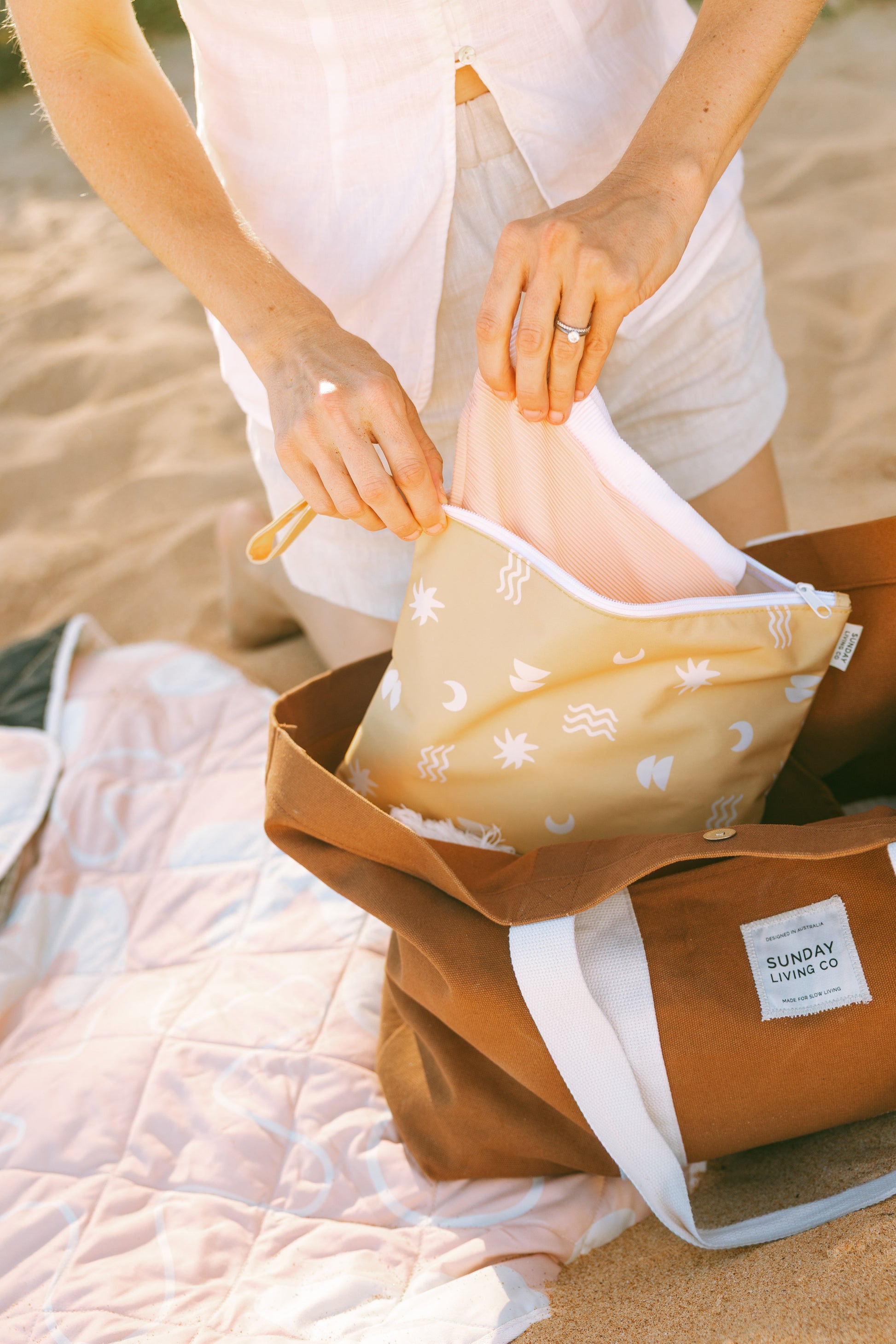Our wet bags are perfect storing wet items such as swimmers, or any other item you want to keep separate within your tote bag such as nappies, wipes, a change of clothes or sunscreen. This bag has an internal waterproof lining so the outside remains dry even with wet items inside.
